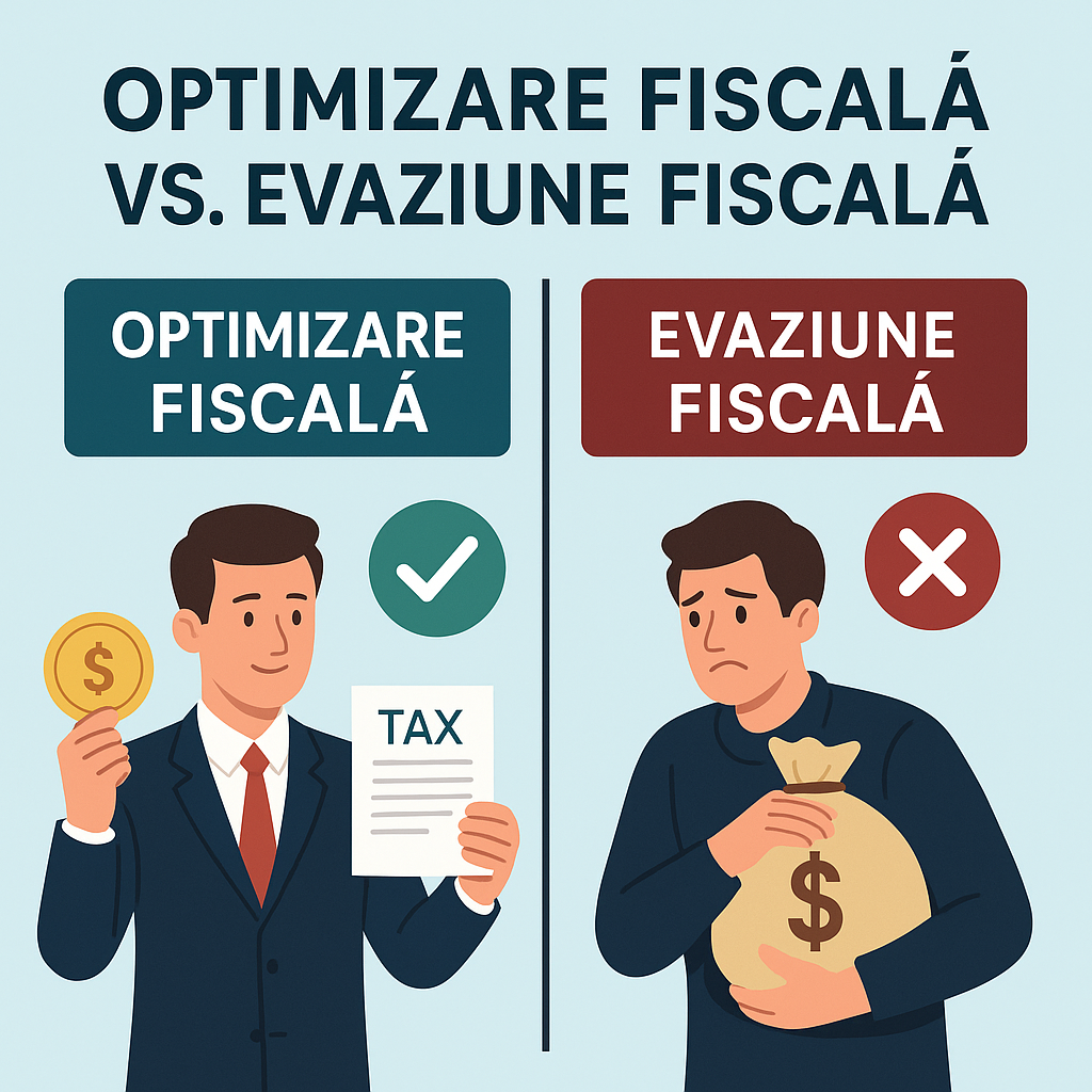 | Consecințe | Reducerea taxelor în mod legal, fără riscuri legale | Amenzi, dobânzi, dosare penale, pierderea dreptului de a desfășura activitate comercială |